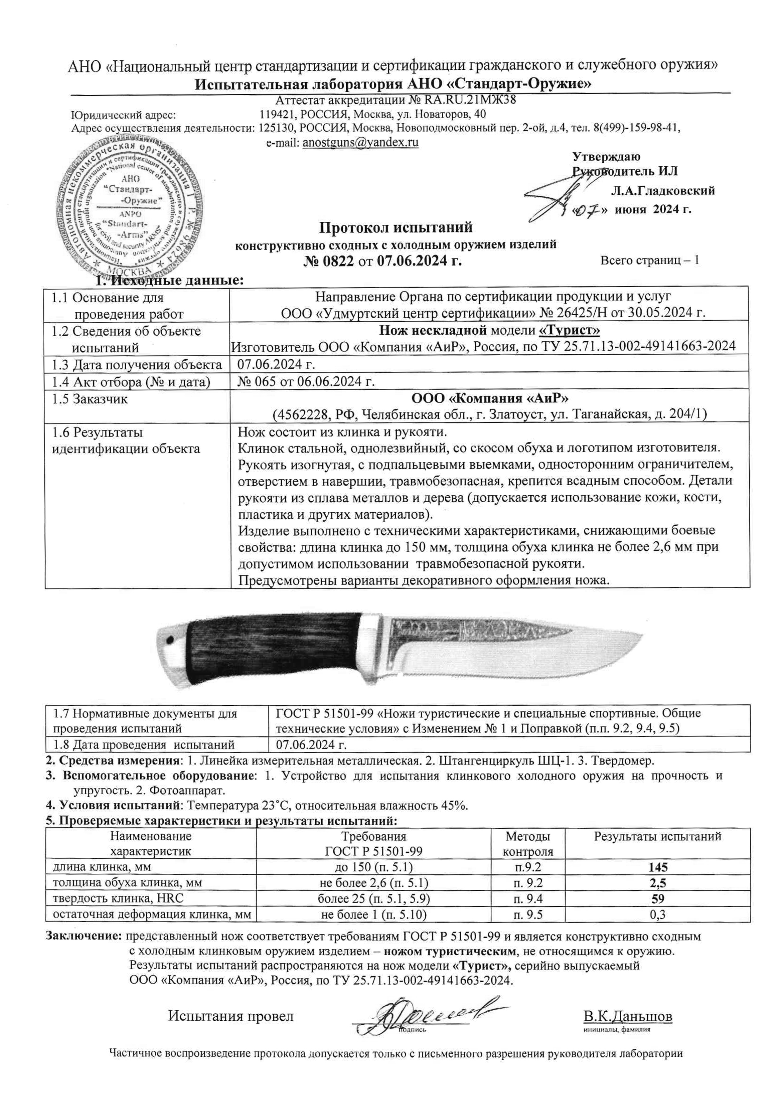 Нож Турист является ножом туристическим и не относится к холодному оружию. Соответствует требованиям ГОСТ Р 51501-99 «Ножи туристические и специальные спортивные. Общие технические условия».
